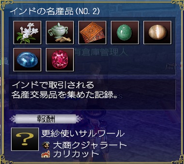 インドの名産品・NO2 メモリアルアルバム 2013年08月14日 コストコ商品の通販[リセールタウン]各メモリアルの入手法上段左端 ジャスミンゴアで購入可能。上段左から2番目 白檀ゴア・カリカットで購入可能。上段真ん中 インド更紗カリカット・ゴア等で購入可能。上段右から2番目 アベンチュリンディヴで購入可能。上段右端 キャッツアイポンディシェリ・マスリパタムで購入可能。生産も可能で工芸R10~レシピは「ジュエリーカット黄の書」(ダンツィヒ・リガの投資報酬・要2m)下段左端 サファイヤカリカット・セイロンで購入可能。生産も可能で工芸R10~レシピは「ジュエリーカット青の書」(ホルムズの投資報酬・要2m)下段左から2番目 ルビーゴア・セイロンで購入可能。生産も可能で工芸R10~レシピは「ジュエリーカット赤の書」(ディヴ・セイロンの投資報酬・要2m)報酬の更紗使いのサルワールは女性交易職用の体装備。会計+1・警戒+2・香辛料取引+1。U-mobile その他の「大航海時代Onlineブログランキング」は←から♪ ブログ内記事をランダムでピックアップ中~ [0回]PR
